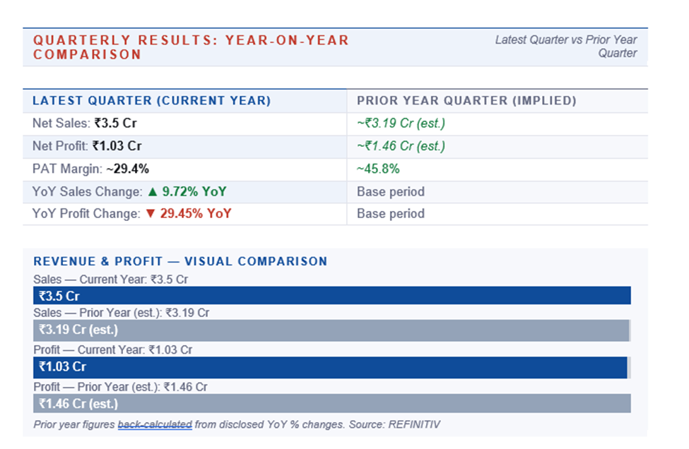 The financial base is small. Quarterly net profit of ₹1.03 crore is down 29.45% YoY, on quarterly sales of just ₹3.5 crore (up 9.72% YoY). In absolute terms, these are tiny numbers where single contracts or one-off items can materially swing quarterly results.