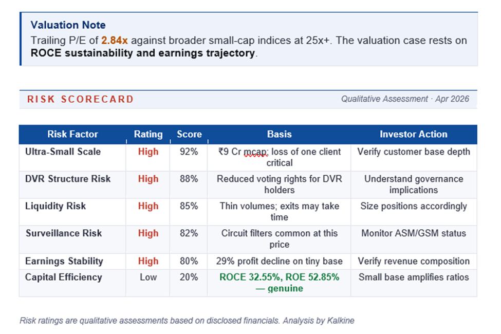 - Ultra-small scale risk: With ₹9 crore market cap and ₹3.5 crore quarterly sales, any adverse event can dramatically impact perceived viability.