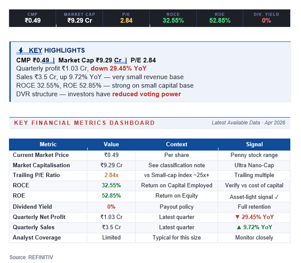 The return ratios tell a more interesting story: ROCE of 32.55% and ROE of 52.85% indicate that the capital employed is very small, and profits represent a meaningful return on that capital. The P/E of 2.84 reflects the nano-cap discount, DVR discount, and earnings volatility.