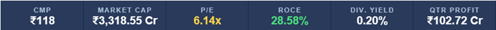 At CMP ₹118 and trailing P/E of 6.14x, KNR trades at a meaningful discount to the Indian roads EPC peer set, which generally trades in a 10–20x earnings band. Given KNR's superior ROCE (28.58% vs. 12–15% for many peers), cleaner balance sheet, and proven capital-recycling capability, the valuation gap appears wider than fundamentals justify.