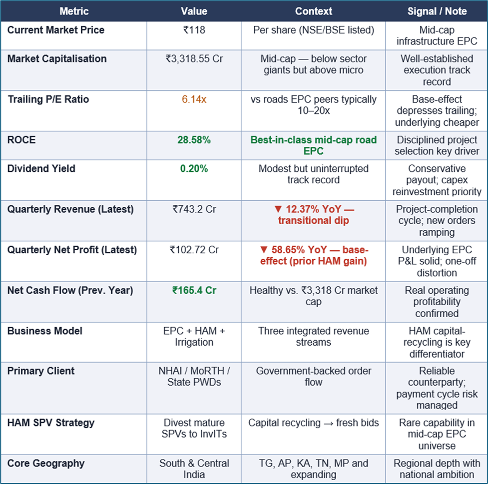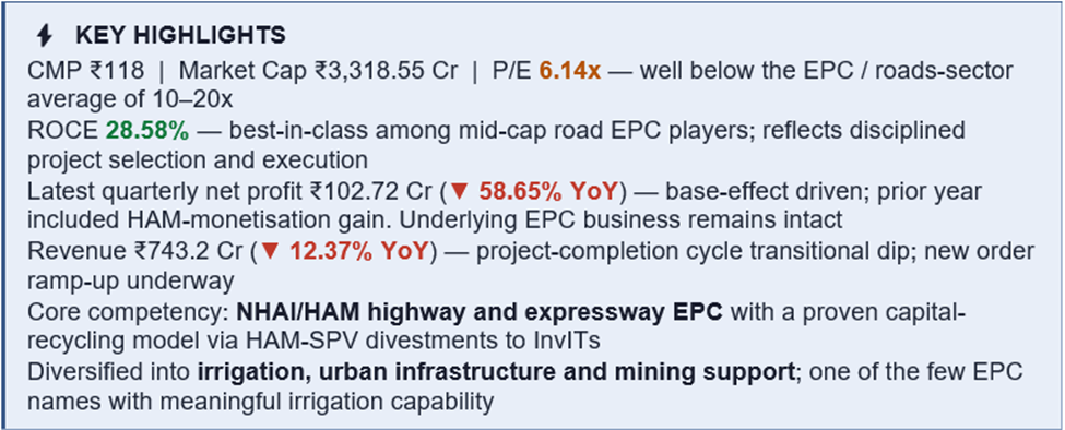 The low P/E reflects (a) the broader de-rating in mid-cap EPC names during periods of slow NHAI ordering, (b) lumpiness in reported profits due to HAM-monetisation gains in prior years inflating the base, and (c) sector-wide concerns on working capital. Given the strong ROCE, the valuation appears conservative on a normalised earnings basis.