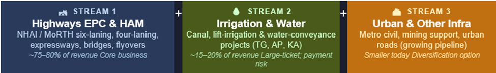 Irrigation projects, particularly in Telangana, carry elevated payment risk during state fiscal stress or political transitions. Delayed payments stretch working capital and can trigger impairments. Investors should track the irrigation-segment debtor days separately from the highways segment each quarter.