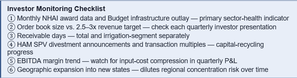 - Regulatory / policy risk: Changes in NHAI payment norms, arbitration processes, or HAM model parameters directly affect sector economics.
