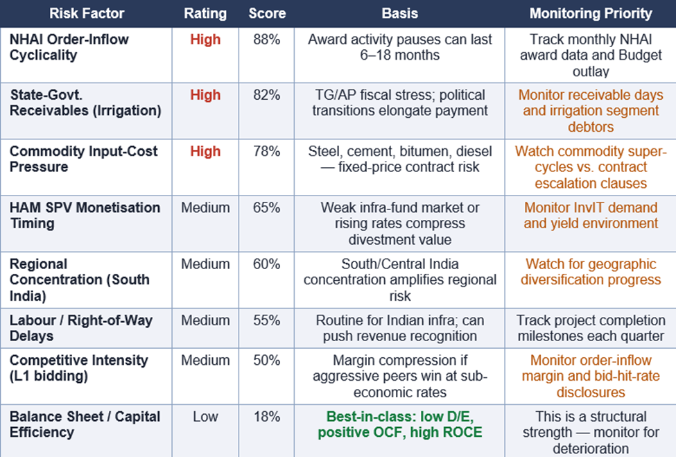 Order-inflow volatility from NHAI, state-government receivables (especially irrigation), commodity cost pressure on fixed-price contracts, HAM monetisation timing risk, and regional concentration in South/Central India. See the Risk Scorecard above for a structured view.