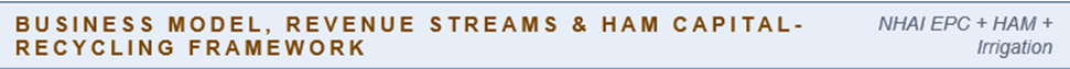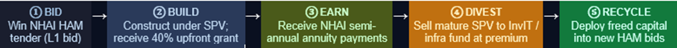 Under the Hybrid Annuity Model, the concessionaire (KNR SPVs) builds the road with a mix of NHAI upfront grants (40%) and its own equity/debt (60%), then receives semi-annual annuity payments from NHAI over the concession period. KNR later divests mature HAM SPVs to InvITs or infra funds to free up equity capital for fresh bids — a build-sell-redeploy model.