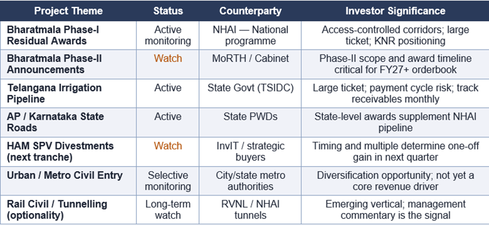 - Competitive intensity: Aggressive L1 bidders can compress order inflows even when KNR doesn't compromise on its own bid discipline.