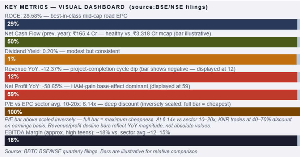 Yes. KNR maintains one of the cleaner balance sheets in the sector, with moderate leverage, healthy operating cash flows (₹165.4 Cr in the previous year), and a track record of dividend payment. The ROCE of 28.58% confirms the underlying quality of the business.