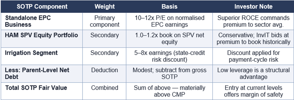Key re-rating catalysts: (1) strong NHAI order awards, (2) visible ramp-up in order book toward 3x revenue, (3) successful HAM bundle monetisation at healthy multiples, (4) entry into new verticals (metro civil, rail civil, tunnelling). Consistent delivery on these unlocks the valuation gap; any setback on order flow extends the discount period.