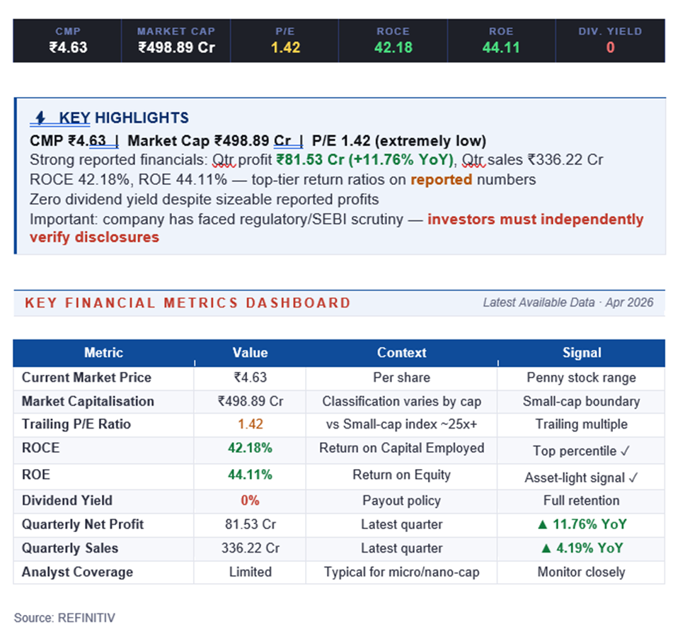Approximately ₹498.89 crore, placing it among the mid-sized penny stocks in the Indian market.