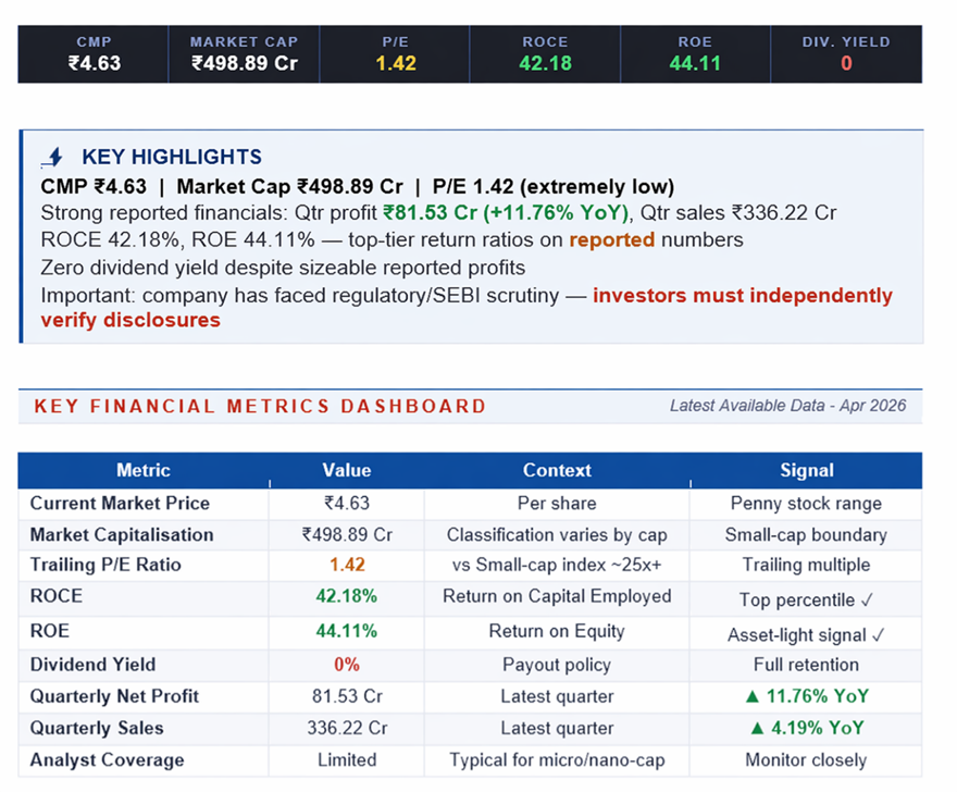 Approximately ₹498.89 crore, placing it among the mid-sized penny stocks in the Indian market.