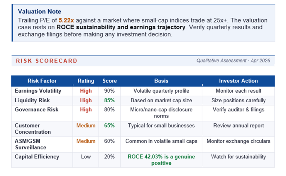 However, as with all nano-caps, the practical question is whether management has a credible pipeline of reinvestment opportunities. Ongoing monitoring of cash balances, capex trends, and promoter communication is essential to form a view on whether the no-dividend policy is creating value.