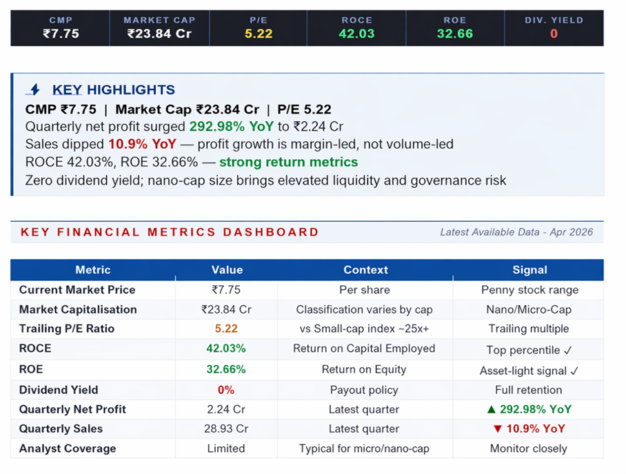 On trailing numbers, the stock looks cheap (P/E 5.22, ROCE 42%, ROE 32%). However, nano-cap liquidity, declining sales, and the need to confirm earnings repeatability make this a speculative rather than conservative opportunity.