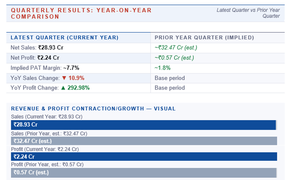 Onesource's latest quarter is striking on the profit line. Quarterly net profit rose 292.98% YoY to ₹2.24 crore, even as quarterly sales fell 10.9% to ₹28.93 crore. The combination of declining revenue and sharply rising profit is an unusual pattern that typically signals one of three things: (1) a one-off gain such as an asset sale, insurance recovery, or tax write-back; (2) meaningful cost restructuring that has dramatically lowered the expense base; or (3) a product-mix shift toward higher-margin categories.