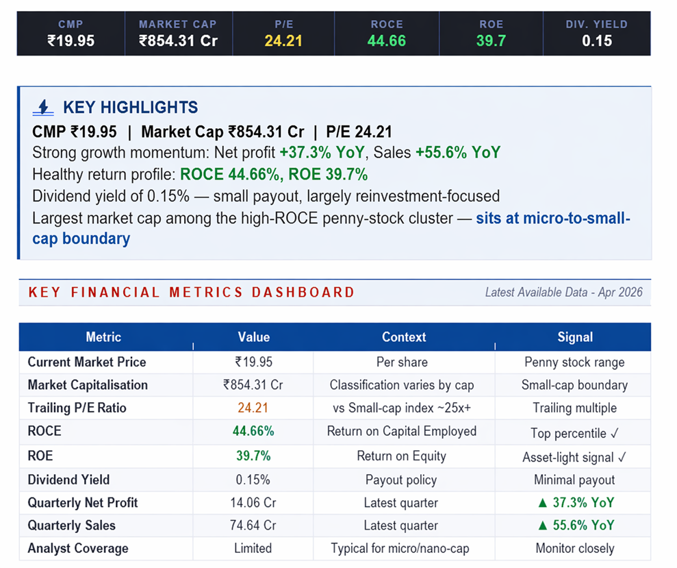 The share price of ₹19.95 places it in the penny-stock price band, but its ₹854 crore market cap puts it closer to the small-cap category than a typical micro-cap penny stock.