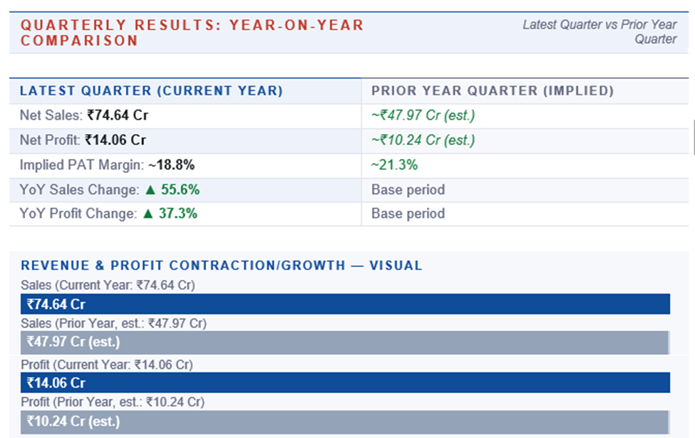 The latest quarter shows net profit up 37.3% YoY to ₹14.06 Cr and sales up 55.6% to ₹74.64 Cr, with ROCE of 44.66% and ROE of 39.7%.