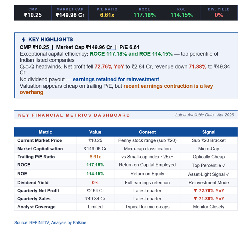 The bright spot remains return ratios. An ROCE of 117.18% and ROE of 114.15% suggest that when the business does generate revenue, it does so with minimal capital employed — a hallmark of an asset-light model. The trailing P/E of 6.61x is optically low, but this multiple will de-rate quickly if the earnings base continues to shrink. Investors should wait for one or two quarters of stabilisation before extrapolating the current P/E as a reliable valuation anchor.
