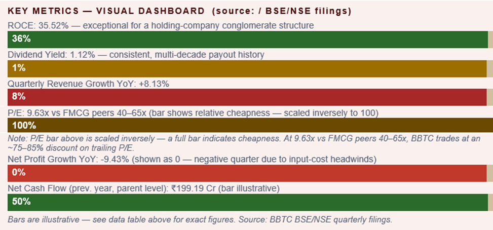 The low P/E reflects the holding-company discount that Indian markets typically apply, plus some concerns about group-level governance and concentration in a single underlying asset. On a pure earnings basis — and especially on a sum-of-the-parts basis — BBTC looks cheap relative to FMCG peers.