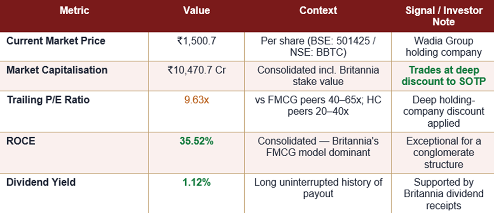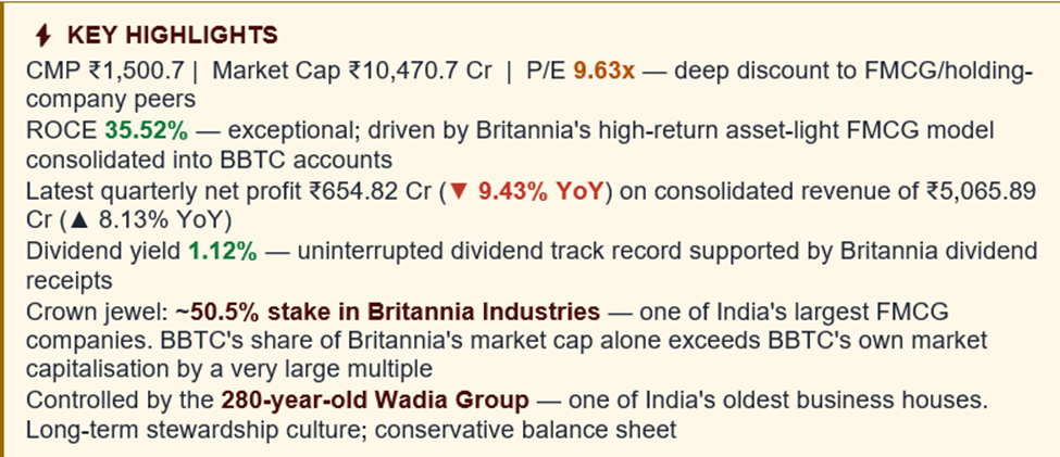Balance sheet: BBTC carries some debt at the standalone level — a point investors should watch — but the consolidated entity is comfortably serviced by Britannia's cash flows. The company's investment book, primarily the Britannia stake, is carried at historical cost on the balance sheet but has a market value that is a very large multiple of the entire BBTC market capitalisation, which is the core of the holding-company-discount thesis.
