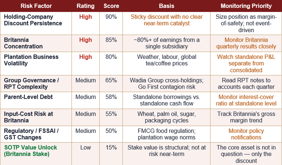 The main risks are: (a) persistence of the holding-company discount, (b) over-reliance on Britannia, (c) volatility in plantation earnings, (d) group-level governance and related-party complexity, and (e) parent-level debt. See the Key Risks section and Risk Scorecard above.