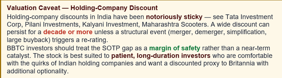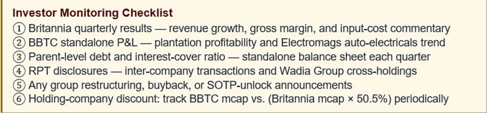 Potential catalysts include: (a) simplification of the Wadia Group holding structure, (b) a large share buyback by BBTC, (c) a strategic demerger or value-unlock transaction, (d) sustained outperformance by Britannia, and (e) monetisation of plantation or real-estate assets. Any of these would reduce the holding-company discount materially.