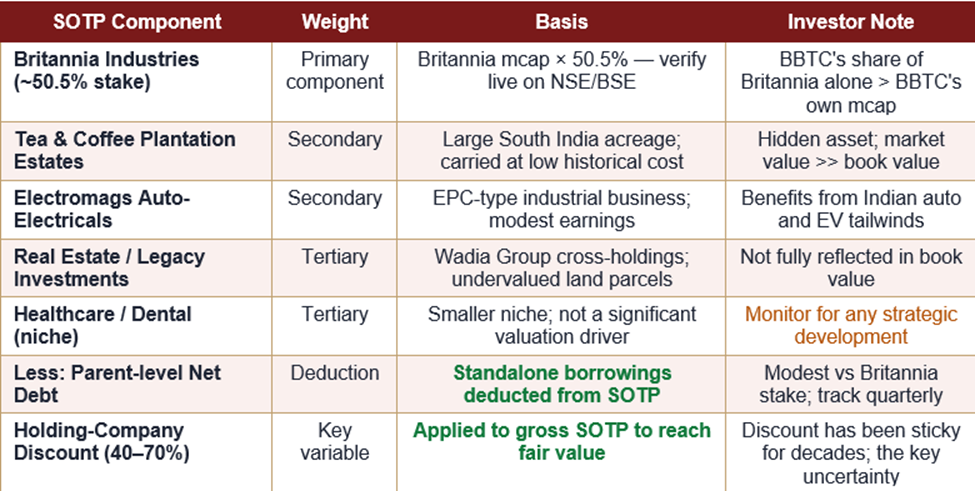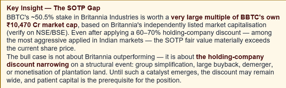 BBTC owns approximately 50.5% of Britannia Industries. Britannia's own market capitalisation (readily available on NSE/BSE) runs into lakhs of crores; BBTC's share of that market value alone is several multiples of BBTC's ₹10,470.7 Cr market cap. Layered on top are plantation land assets, auto-electricals earnings, and real-estate holdings — each adding further value. Even after applying an aggressive holding-company discount of 60–70%, the SOTP fair value typically sits well above the current market cap.