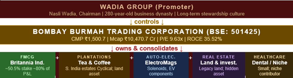 BBTC is a 163-year-old Wadia Group holding company that operates tea and coffee plantations, auto-electrical components (Electromags), healthcare products and real estate, and holds a ~50.5% controlling stake in Britannia Industries Ltd. Most of its consolidated revenues and profits come from Britannia.
