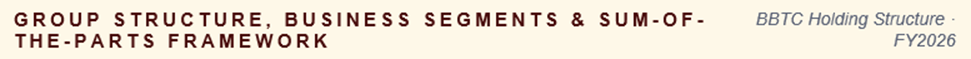 BBTC's corporate structure makes it unique on Indian bourses. While the company runs its own operating businesses — tea, coffee, healthcare, auto-electricals, horticulture and real estate — the dominant driver of its consolidated financials is its roughly 50.5% controlling stake in Britannia Industries Limited, one of India's largest and most profitable packaged-foods companies. Because BBTC consolidates Britannia's revenues and profits into its own accounts under Indian accounting standards, the company's reported top-line of over ₹5,000 Cr per quarter is largely a reflection of Britannia's scale rather than BBTC's standalone operations.