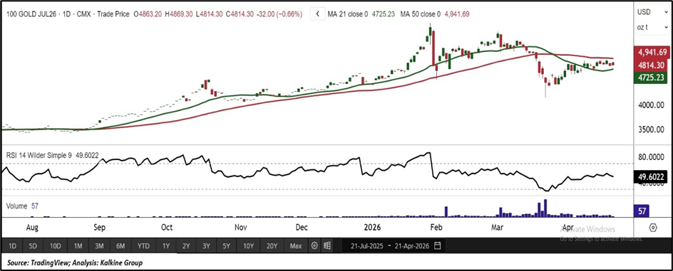 Gold futures are currently trading near $4,814, below the 50-day moving average near $4,941.69 but above the 21-day moving average near $4,725.23.