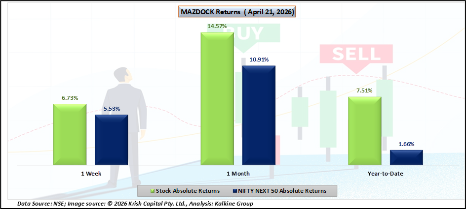 Shares of Mazagon Dock Shipbuilders Limited (NSE:MAZDOCK) were trading at ₹2,663.50 on April 21, 2026, up ₹42.30 or 1.61% from the previous close of ₹2,621.20. The stock opened at ₹2,639.00 and moved within a range of ₹2,634.30 to ₹2,707.40 during the session. The volume traded stood at 15.68 lakh shares, with a traded value of ₹419.62 crore.