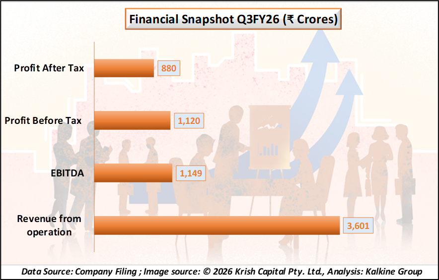 The company reported revenue from operations of ₹3,601 crore in Q3 FY26, compared to ₹2,929 crore in Q2 FY26. Profit after tax (PAT) stood at ₹837 crore in Q3 FY26. Operating margins were around 24% during the quarter.