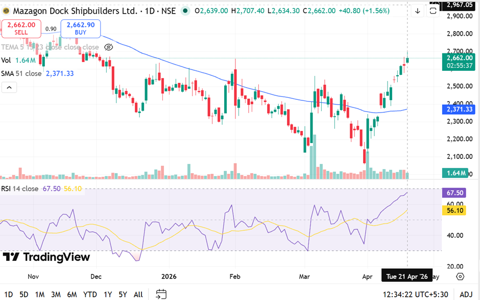Mazagon Dock Shipbuilders (NSE:MAZDOCK) is trading near ₹2,662.00, up around 1.56%, and continues to remain above the 51-day SMA near ₹2,371.33, while the 14-day RSI near 67.50 points. Immediate support is placed in the ₹2,400.00–2,300.00 zone, while resistance is seen near the ₹2,800.00–3,000.00 range.