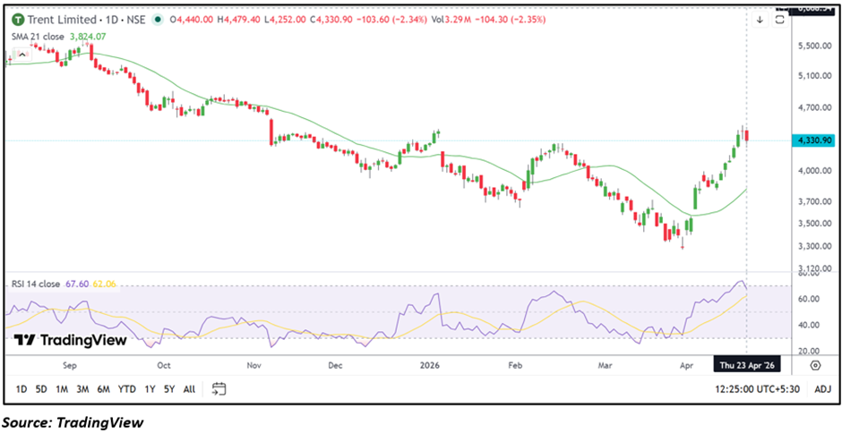 Technically, Trent is trading near ₹4,330.90 and continues to hold above its 21-day SMA positioned around ₹3,824.07, maintaining a constructive short-term structure.