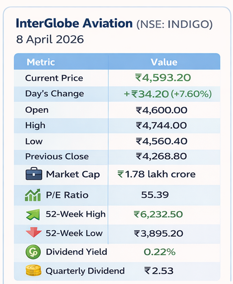 - InterGlobe Aviation Ltd (NSE: INDIGO) surged +₹324.20 (+7.60%) to ₹4,593.20 on 8 April 2026, touching an intraday high of ₹4,744.00 — a move that briefly approached a near-10% intraday gain before a measured afternoon pullback.