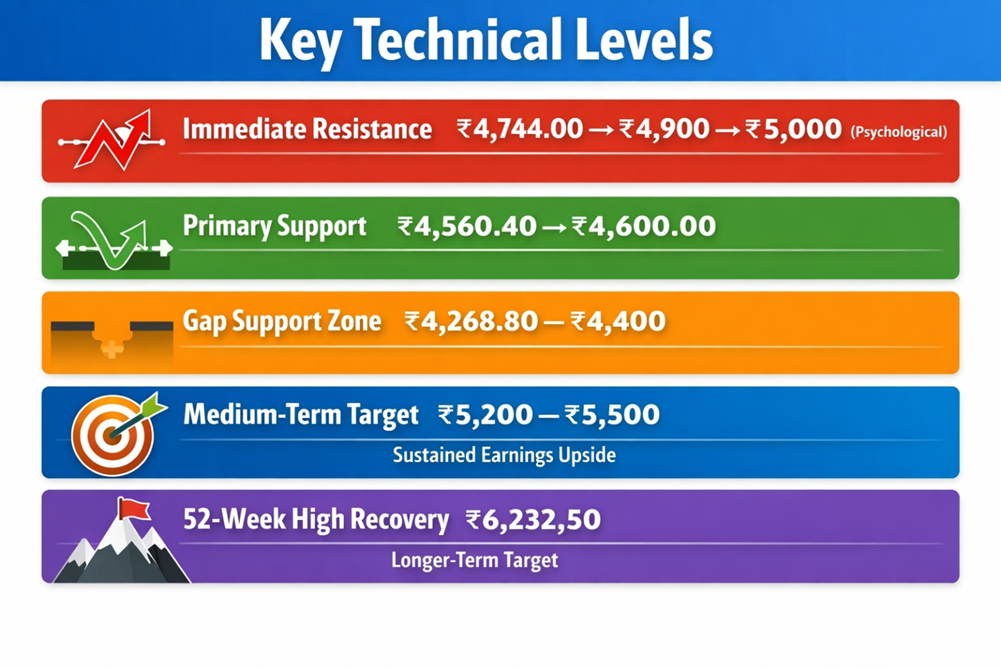 Intraday High as Near-Term Resistance: ₹4,744.00 — today's high — becomes the immediate resistance level. A sustained close above this level on volume would signal continuation of the uptrend and open the path toward the ₹4,900–₹5,000 psychological range.