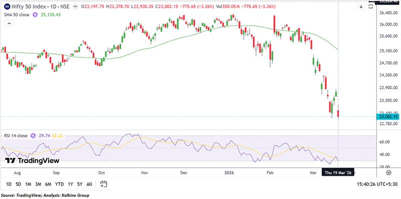 Index Update: The NIFTY 50 Index is trading near 23,002.15, declining 775.65 points (-3.26%), reflecting sharp selling pressure in the recent session. The index remains well below its 50-day Simple Moving Average at 25,135.43, indicating a weak broader price structure. The recent price action shows an extended downward move after a prior consolidation phase. Momentum indicators remain subdued, with the RSI near 29.74, suggesting oversold conditions. On the downside, 22,800–22,300 may act as a support zone, while 23,800–24,400 could act as a resistance band influencing the near-term direction.