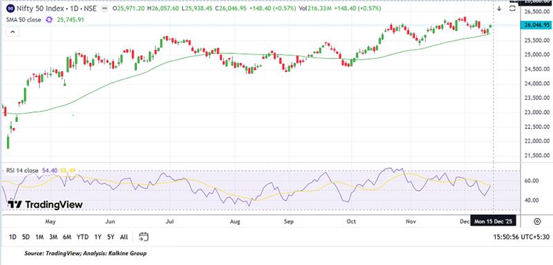 Index Update: The Nifty 50 advanced 148.40 points to close at 26,046.95, maintaining its position above the 26,000 mark and key support zones, preserving the broader bullish structure. The index remains well above the 51-day SMA at 25,745.91, indicating steady support, while the RSI at 54.40 points to improving momentum. Immediate support lies near 25,500, with resistance at 26,500. A breakout above 26,350 could further boost near-term sentiment.