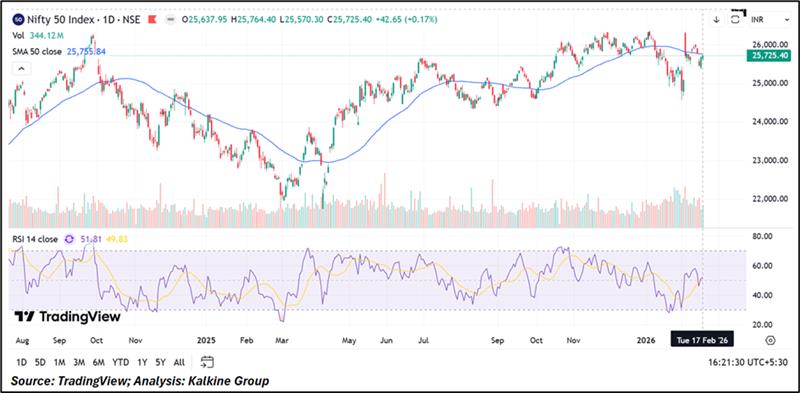 Index Update: The Nifty 50 ended marginally higher at 25,725.40, extending its recovery after early volatility and closing near the day’s high. The index is hovering close to its 50-day SMA at 25,755.84, keeping the near-term structure at a critical juncture. Momentum remains neutral, with the RSI around 51.8, reflecting balanced market conditions. On the downside, 25,500 and 25,000 remain key support zones, while on the upside, 26,000 and 26,350 continue to act as major resistance levels. A sustained move above these levels could strengthen the ongoing recovery trend.